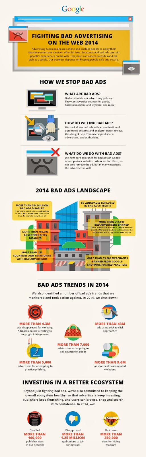 In this new infographics from Google its seems there is shortage of scammers - last year alone, more than 7,000 Advertisers promoted counterfeit goods, 250,000 sites from Google's network were removed for hiding malware and 2.5 million ads related to weight loss and dietary supplements were not shown.