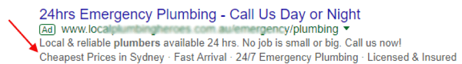 Callouts improve the text in your ads by promoting unique offers to people searching for your products or services. For example, if you are a plumber, you might add these call to action words: “Fast Arrival · 24/7 Emergency Plumbing · Licensed & Insured”.