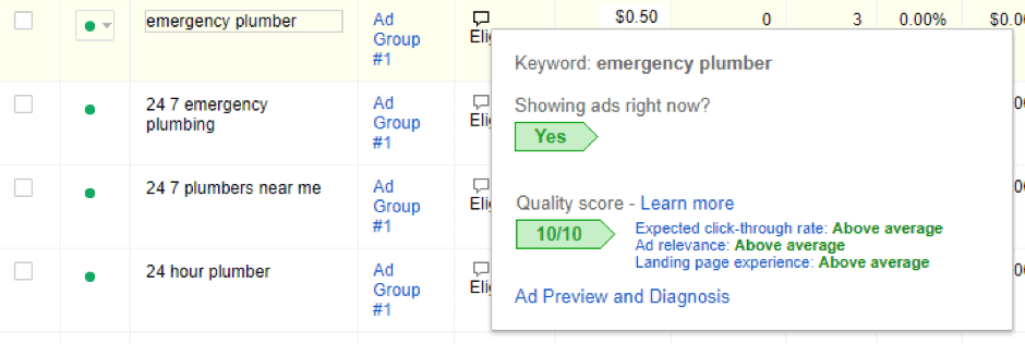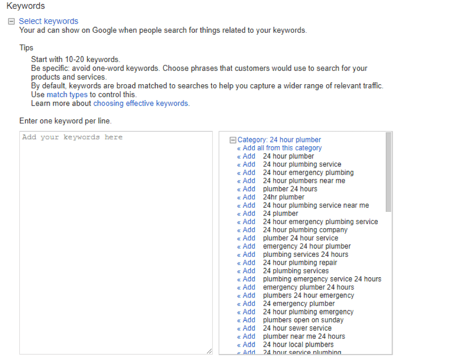 For example, a plumber in Sydney might have “plumber 24 hours” or “emergency plumbers” as their keywords, or possibly “plumbing services” with the location set to only show the ad in Sydney. The more obviously-relevant your keywords are, the better for your AdWords campaign (although the most common keywords might mean you have to bid more to get your ad in a prime position).