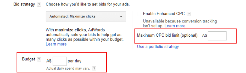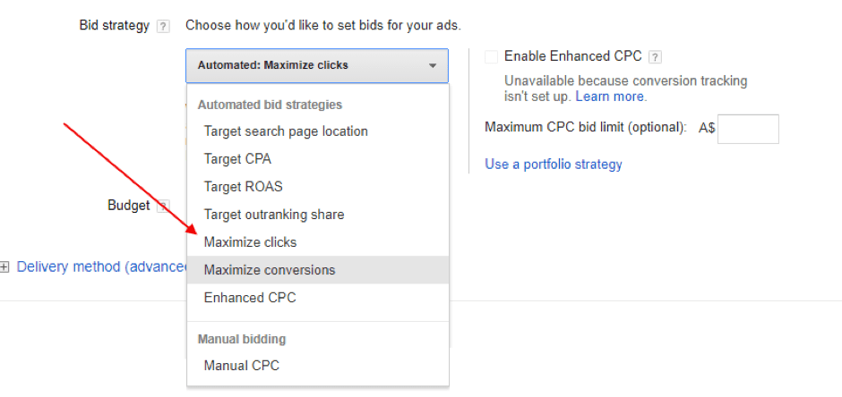 There are many bid strategy options. To get the biggest internet traffic at the lowest cost, it is advisable to select “Maximize clicks”, as shown below.