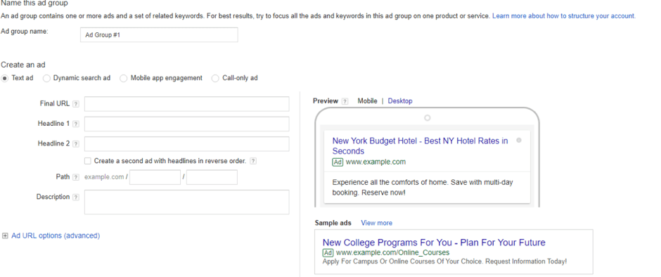 The next step is creating an ad. Your ad should be creative with a catchy title and description. In the first line, you should include your landing page from your website (“Final URL”). Your headline should include your main keyword(s) and the description should include a “call-to-action”.