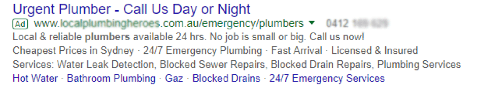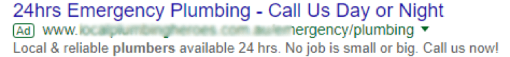 As you can see, the owner targets people seeking a plumber. The keywords “emergency plumbing” and “plumber” are used in the heading and in the description.