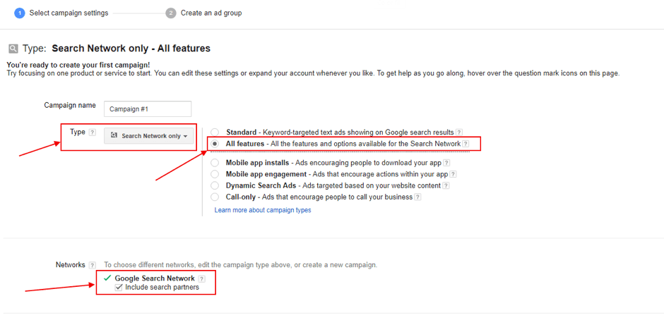 By default, your campaign type will be “Search Network with Display Select“ - it means that your ads will run across Google’s search results and all display ads (including the ads of Google partners). The first thing you need to do is select the campaign type: “Search Network only”, and select “All features - All the features and options available for the Search Network”. Google’s search network tends to deliver the best value for money, especially with a limited budget.