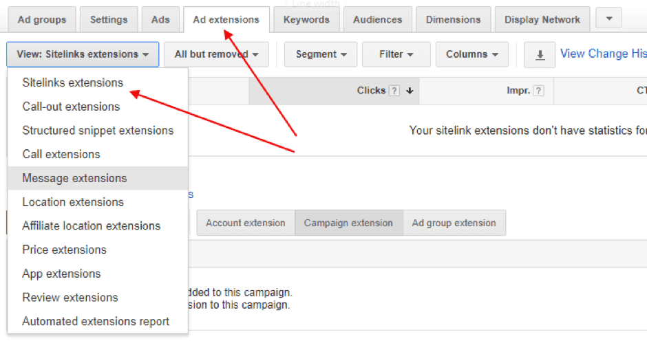 In order to set up site links, go to Campaign, click at “Ad extensions” (at the top menu) and chose “Sitelink extensions”, see below:
