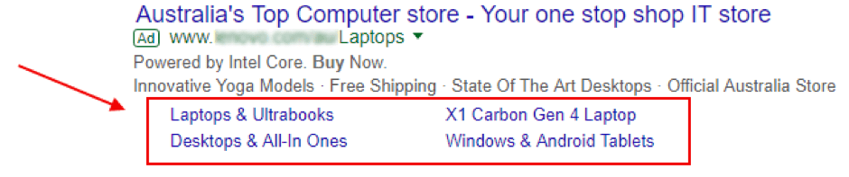 Sitelinks are the additional links often displaying below the ad description. This is a good way to get more content displaying, so people can see more of the products or services you offer. Below is an example of a shop offering laptops online.