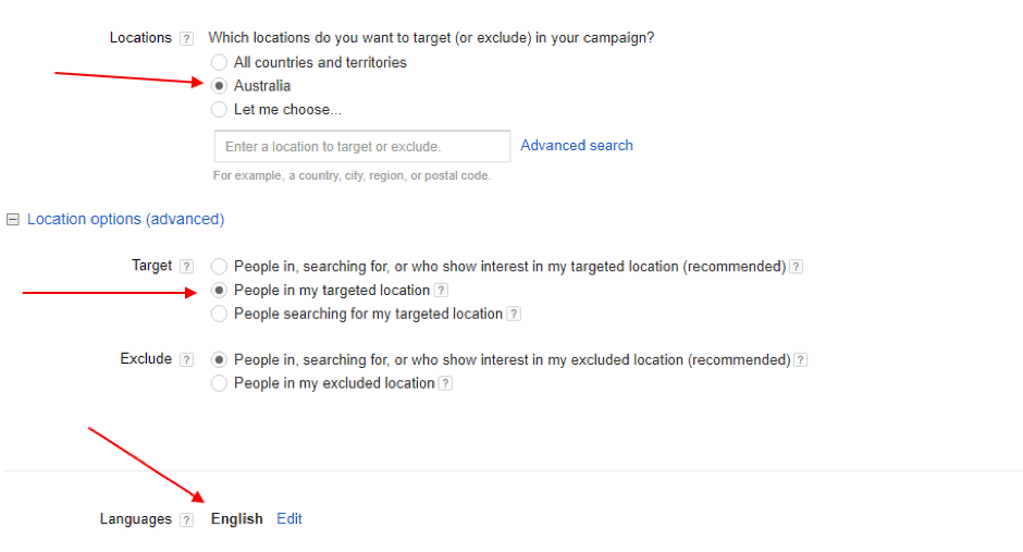 In order to avoid unwanted clicks on your ads (as you pay per click), you want to use more advanced settings, such as setting up your target audience as “People in my targeted location”. It means that if for example, you target law services in Australia, a person who is in India won’t see the ads as they will only display for people physically present in Australia.