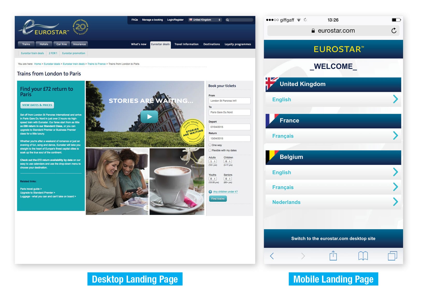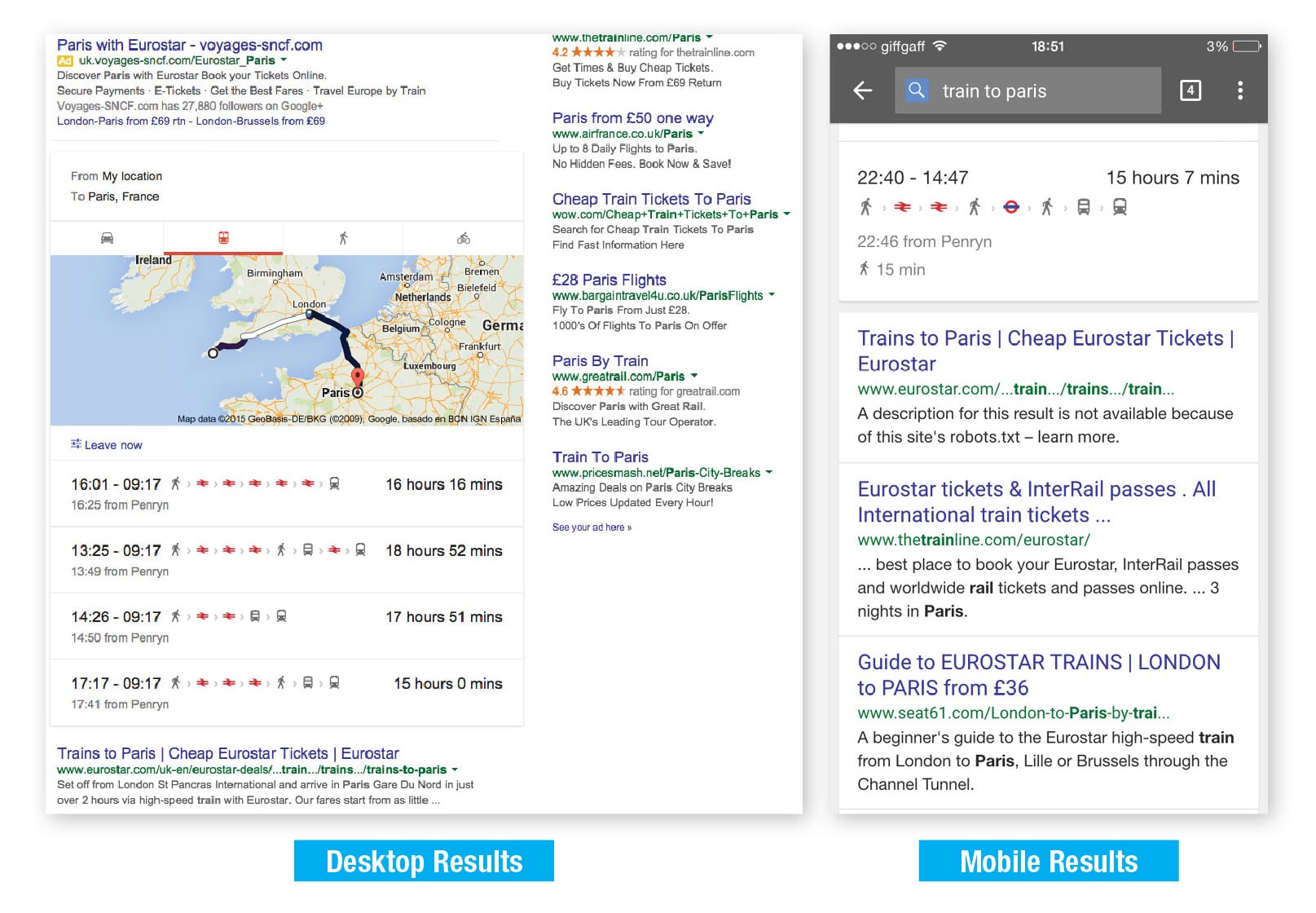 Here's an example where both desktop and mobile search results for the query [trains to paris] return Eurostar as the top result (as expected), but the experiences are different: