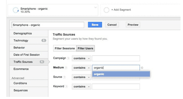 Within Google Analytics you can check the impact by isolating mobile traffic through the creation of a Custom Segment (formerly Advanced segments) by choosing ‘+Add Segment’ from the bar at the top: