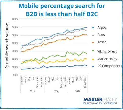 By compiling search trends for major B2C and B2B retailers, Marler Haley identified that there is less than half mobile search traffic for B2Bs in comparison with B2Cs.