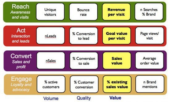 As can be seen in the graphic above, RACE looks at metrics at each stage of the purchase funnel and takes into consideration the VQVC elements covered in the previous section.
