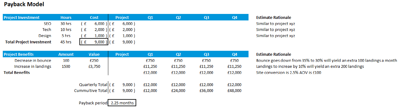 Using the learnings you may have from previous SEO work and the site conversion rate data you have at your disposal, it may be possible to work out the payback period for a particular project: