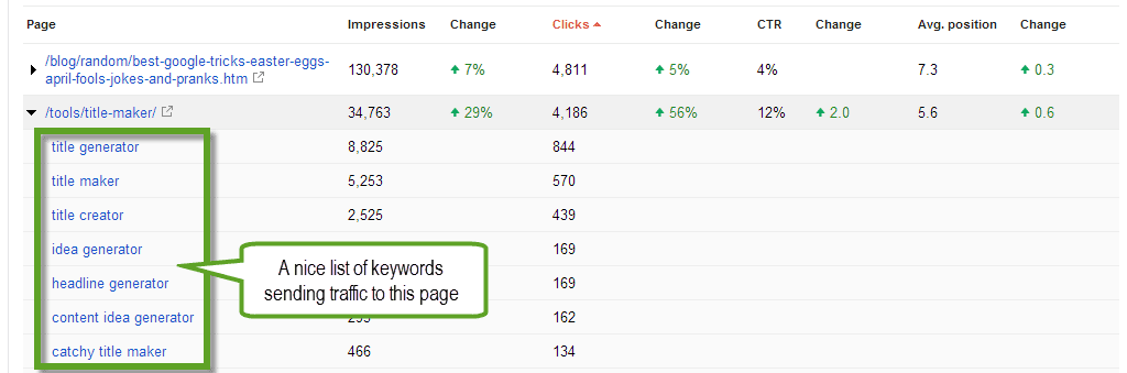 Despite the limitations and caveats Google Webmaster Tools data, this will at least provide an indication of top keywords by landing page, which can be used alongside Google Analytics to assess how your search engine optimisation efforts for these keywords have resulted in an increase in overall organic search visits for each top landing page. This can then be used to correlate improvements in SERP visibility with traffic to your website: