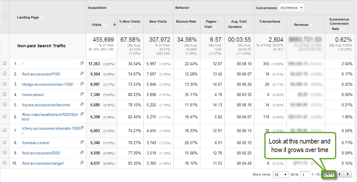 • Step 2. Using a the methodology from method 1, above, calculate the revenue value of organic search traffic by applying a conversion rate and average order value. This will give you a baseline from which to measure your ongoing SEO activity.