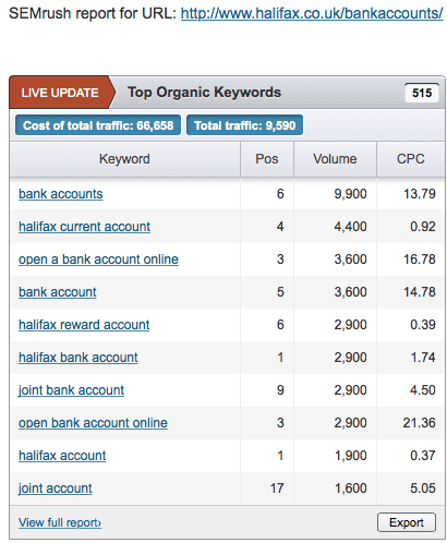 • Step 1. Value organic search traffic using paid search cost-per-click values to calculate the equivalent media spend value of the traffic if it were being paid for. Due to the complications with ‘Not provided’, you use the methodology from method 2, above, to model the value of top landing pages. Alternatively, tools such as SEMrush can be used to provide a value estimate by landing page by assessing the traffic being driven by top keywords: