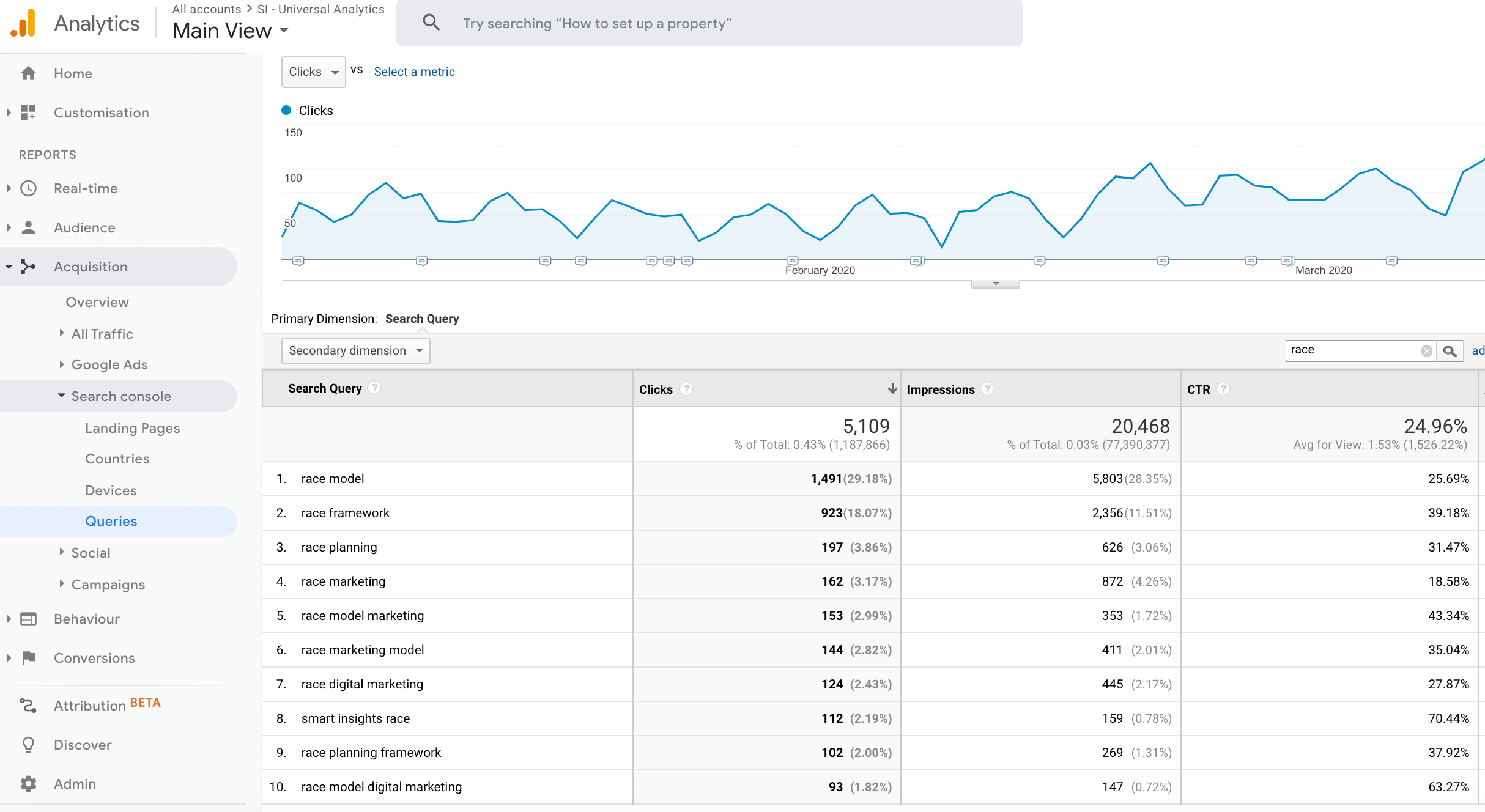 Use the Export menu to create a spreadsheet .xlsx import when viewing the keyword queries, this screengrab shows a summary of our keywords related to our race planning framework.