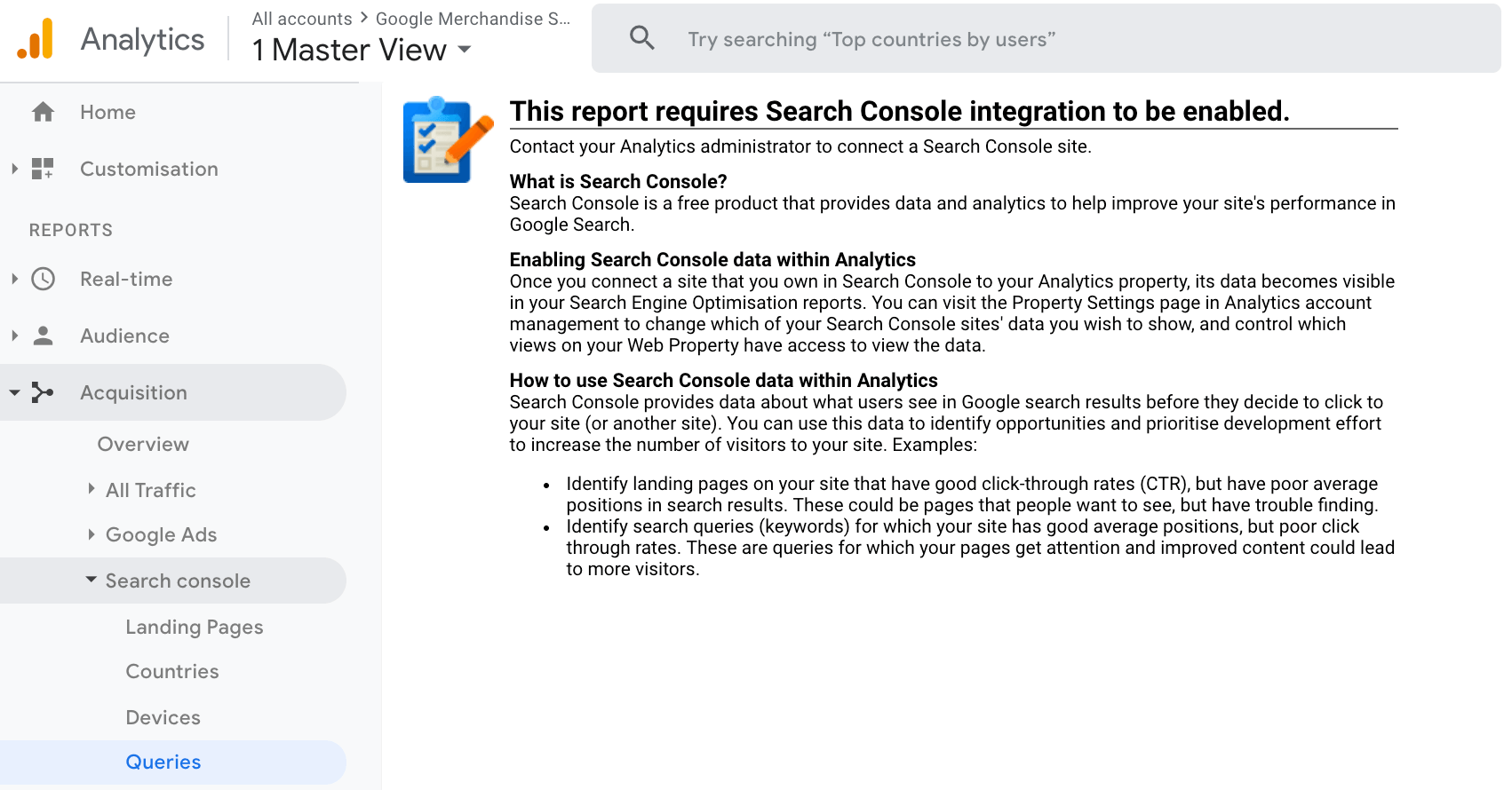 Visit the Search Engine Optimization, Queries menu under the Acquisition menu options as shown below. If you see this message you need to associate Google Analytics with Google Search Console - article updated for GA4.