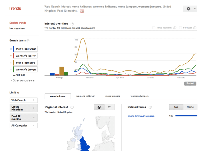 A great example is retail fashion – each season has its theme and only a few of these themes will stand the test of time. Also some trends are cyclical/seasonal so will phase in and out of search e.g. Knitwear – popular at Christmas and through Winter.