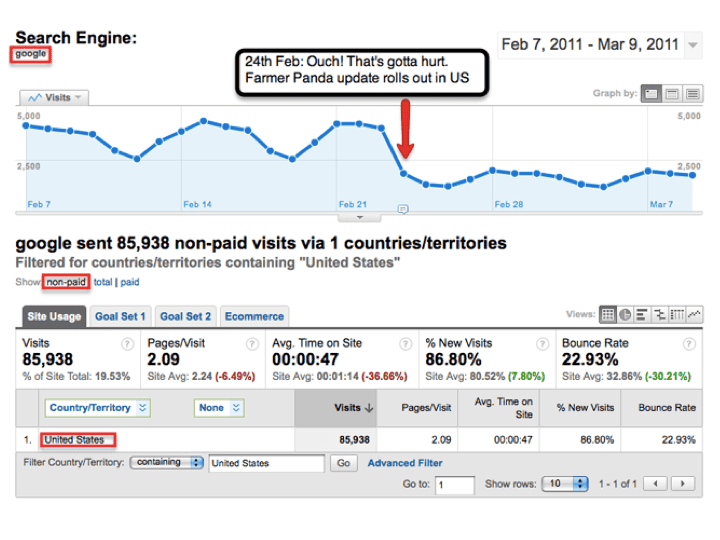 The bête-noire of search. In 2012 a few companies have been hit hard by the two big impact Google updates, Panda and Penguin. Their traffic and rankings took a nose dive as their sites fell foul of a change in how Google assesses page quality and relevance.