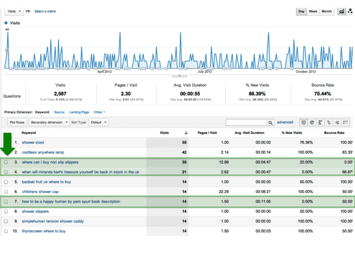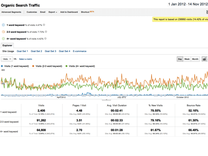 I like to compare data for keyword queries with 1 word, 2-3 words, 4-5 words and 6 or more words. It helps me understand how well a site caters for searches across the tail, as well as identifying outliers (search terms I’d never have thought of yet are relevant to the content on the site).