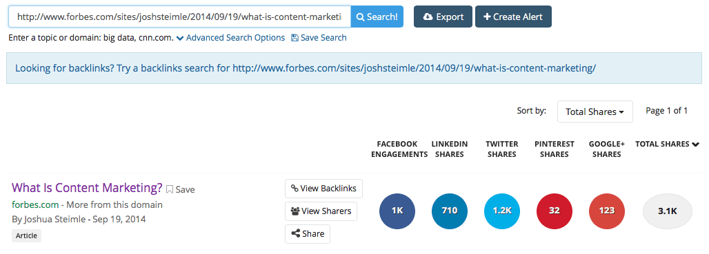 For Social Signals, I use Buzzsumo’s social sharing search tool. For illustration purposes, I have used a link that has been shared a lot of times. Here’s what a typical result looks like: