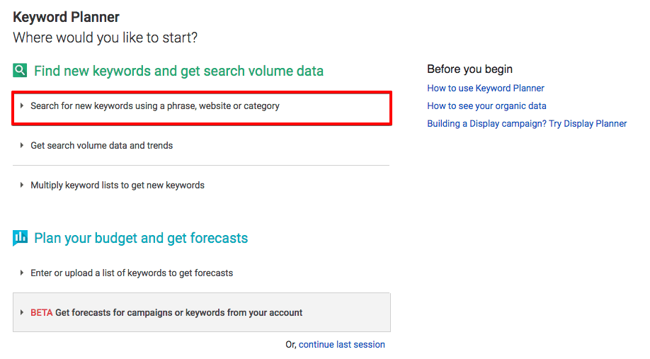 - Go for the first option which says, “Search for new keywords using a phrase, website or category”.