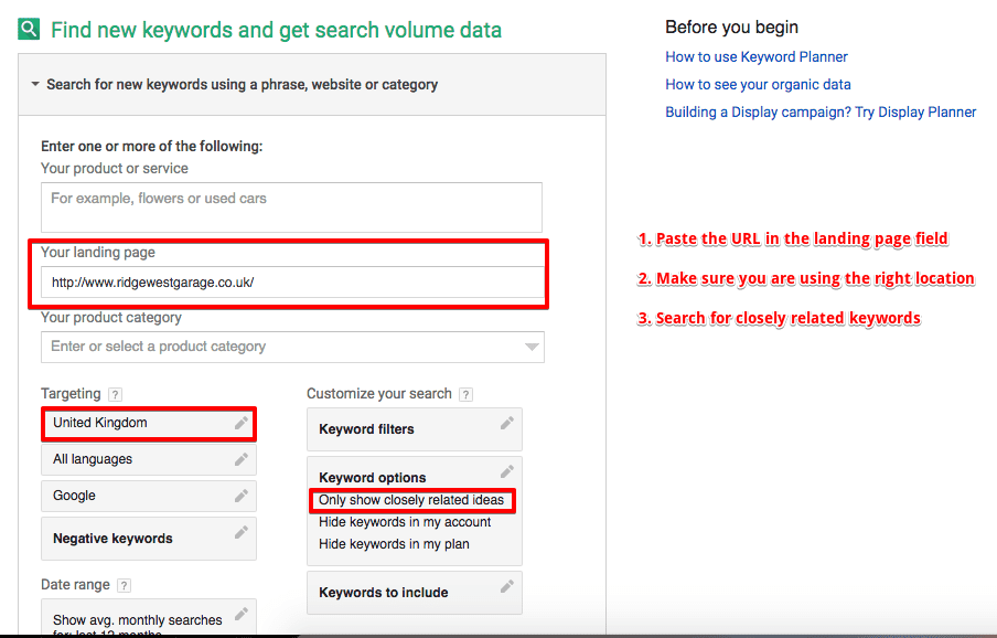 - Choose the right target geography and choose to show only closely related keywords.