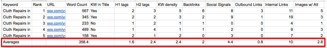 Note these metrics down for all the top results in a spreadsheet and average out the results. Important: If the results vary too much, you might want to do a mean value calculation rather than average. Create an easy to understand template like shown below: