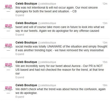 Not being engaged with your fans and current events can result in a serious social faux pas. In the hours following the 2012 Aurora, CO massacre, a fashion boutique noticed that #aurora was a trending hashtag on Twitter and posted a tweet using this hashtag to promote their “Aurora” dress.