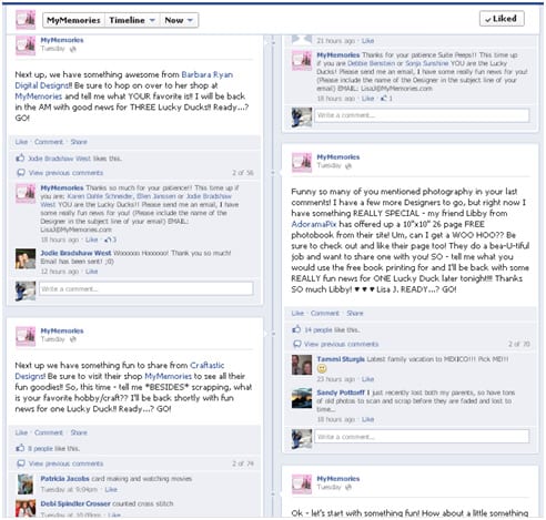 Social media-based events can also be a great way to engage your fans. Many organisations host Twitter chats and Facebook events, such as the quick scrap events and digital scrapbooking kit giveaways run by MyMemories, makers of digital scrapbooking software. MyMemories regularly gets more than 50 comments on a giveaway post, as you can see below.