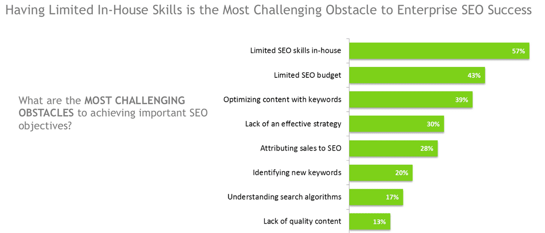 So the majority of respondents were positive, but here we pick out the challenges of Enterprise SEO. As the graph shows, companies who were not seeing the benefits, felt that their challenges were around a lack of in-house SEO skills, limited budget and difficulty in optimizing content with keywords.