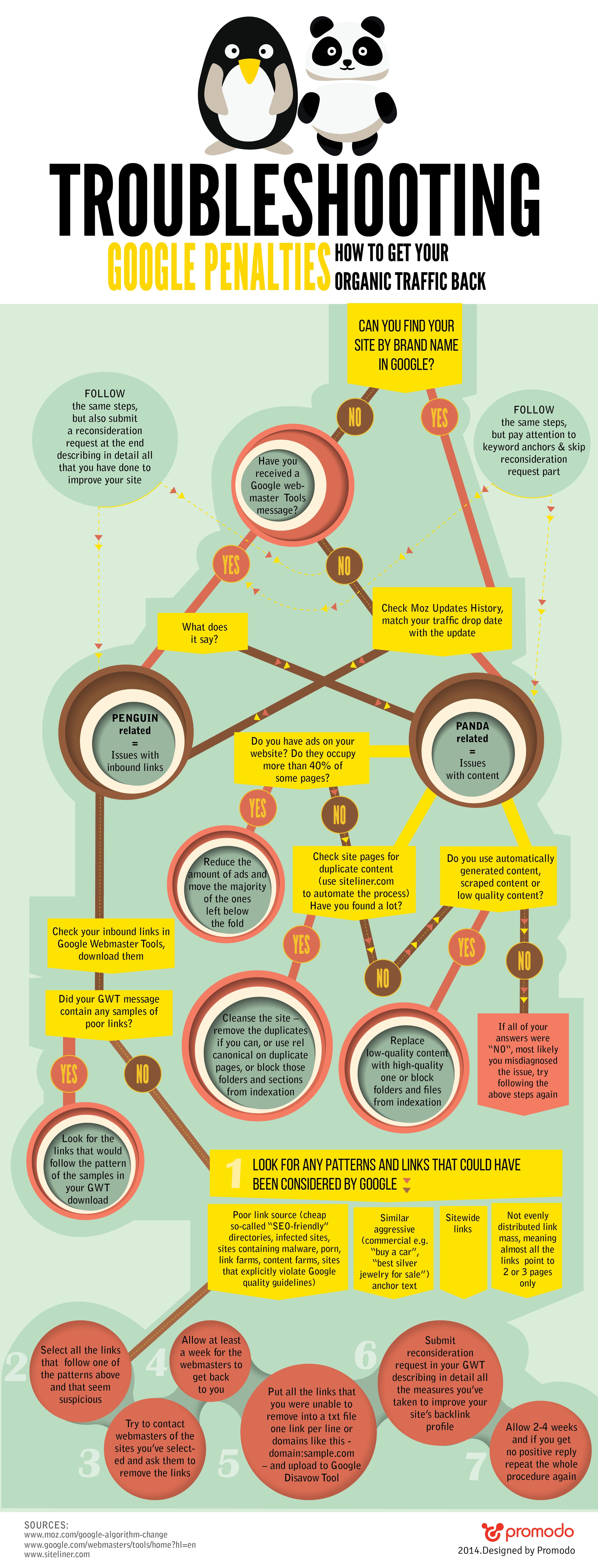 Promodo's Troubleshooting Google Penalties infographic gives a simple introduction with a practical process chart to take you through the steps of how to 'get your organic traffic back' and the associated tools to help along the way. It's a little dated now, but the main factors of the Penguin and Panda updates it describes still apply.
