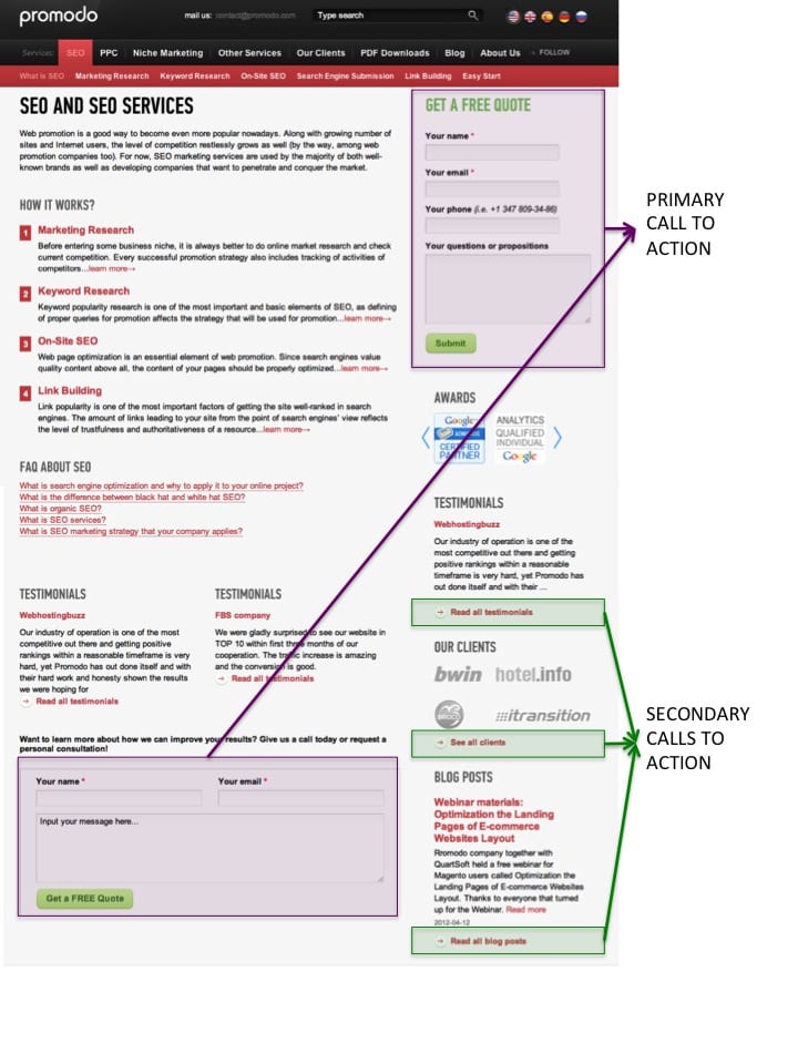 Let’s take a working example. If you look at Promodo.com , there is a landing page to promote their offer of a free SEO quote. This is the primary goal of the page. However, look more closely and you will find other calls to action, intended to keep visitors active with the website to increase the chance for future conversions.