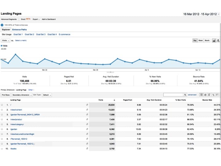 Example: Content > Site Content > Landing pages report in GA