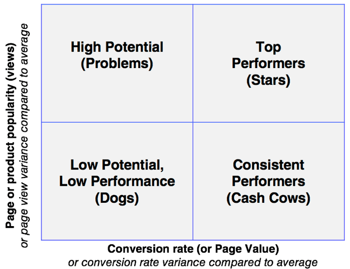 As part of your SEO and AdWords programmes, we recommend prioritizing improvements by thinking of your content as a portfolio of pages of different types, which contribute different amounts of value to the business based on their popularity and conversion rates.