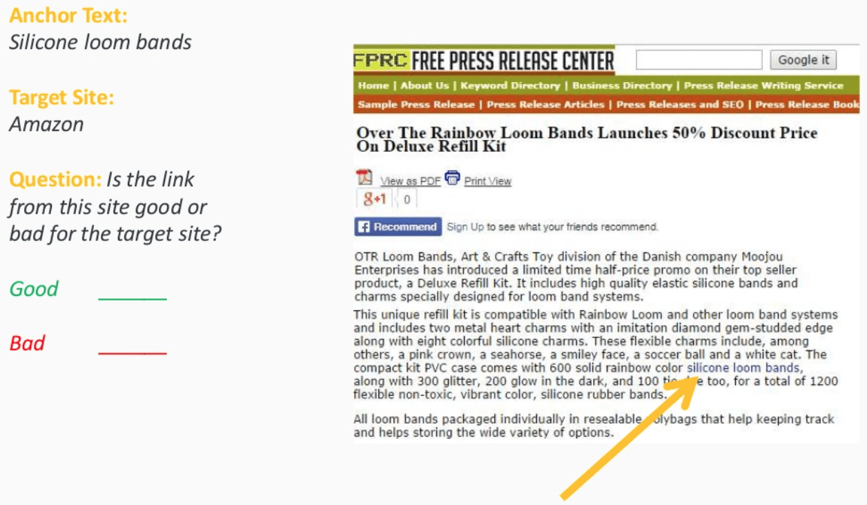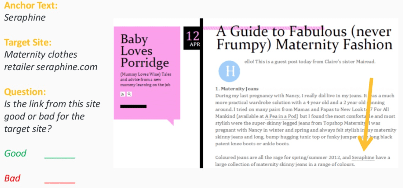 To begin answering these questions, we first looked at what constitutes a good or bad link. Without looking at Google’s Webmaster guidelines, the audience were asked to spend 20 seconds on 13 examples of links to decide whether they are the types of links that could harm websites and therefore not compliant with Google’s Webmaster guidelines.