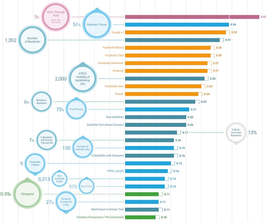 This infographic highlights some of the dangers of relying on ranking factors correlation compilations without wider knowledge and your own tests. For one, correlation doesn't equal causation. Sharing on social networks have a strong correlation, yet this may simply be because of the quality of content which increases dwell time on the post - a factor not shown here. Likewise the occurrence of keywords within the title tag of a post or anchor text linking to a post remain important, yet they aren't clearly shown here. And you will likely fall foul to the Penguin filter if you generate too many links with the same anchor text linking to one page. Subtleties you just can't see from a chart.