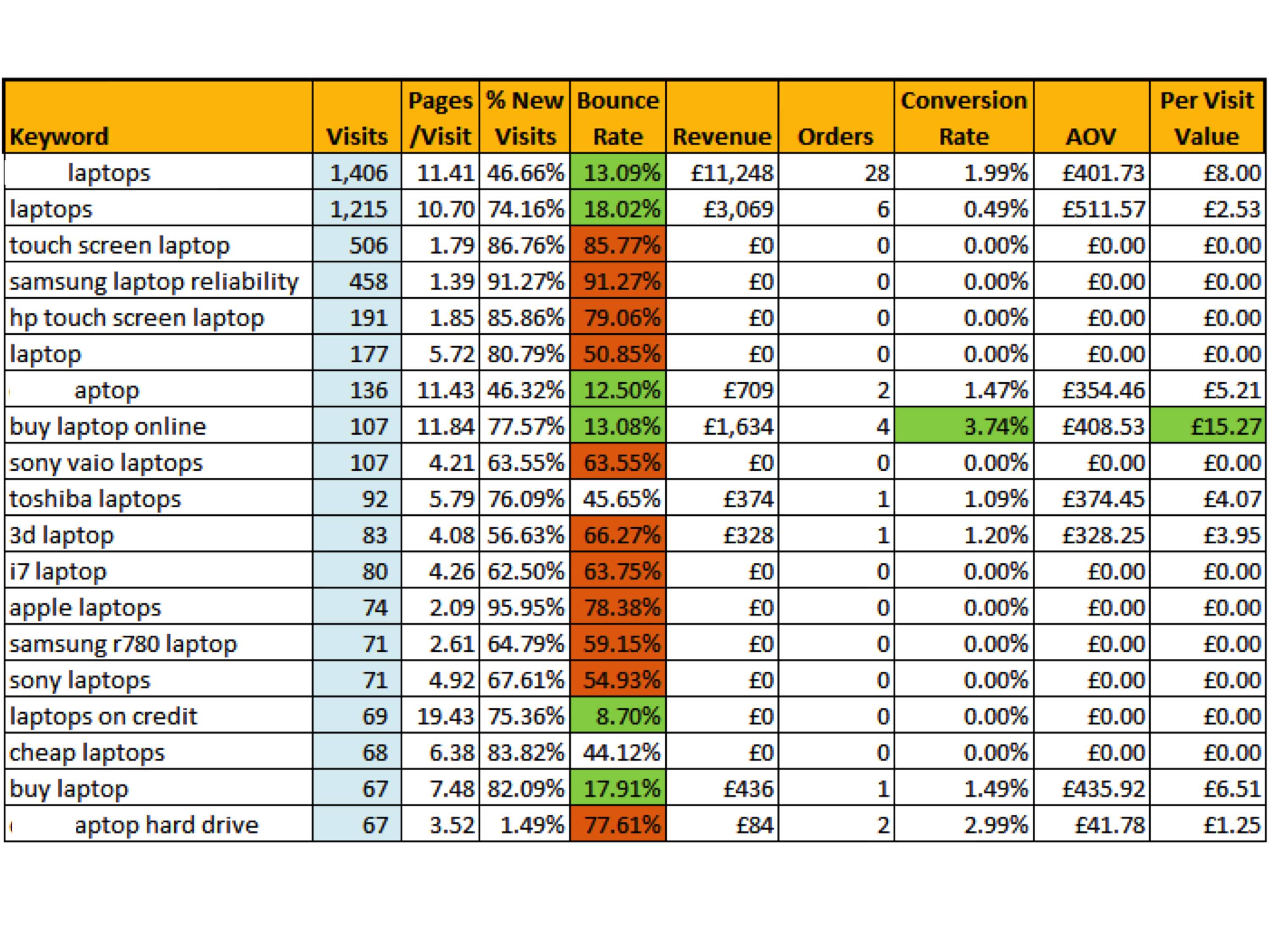 I find colour coding the data really helps, especially when presenting it in meetings. If you’re trying to explain what you’ve achieved with SEO to senior management, you can beat the instant impact of a big green box showing a high £ value.