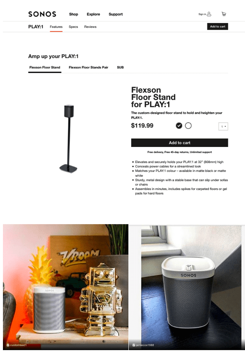 Sonos has mastered this by embedding Instagrammed UGC as part of the buying process on its website. On a Sonos product page, you’ll find not only marketing material and product specs, but also customer photos depicting how they use the brand’s speakers in their homes. These images seamlessly invite new customers to imagine how a Sonos product could improve their own lives.