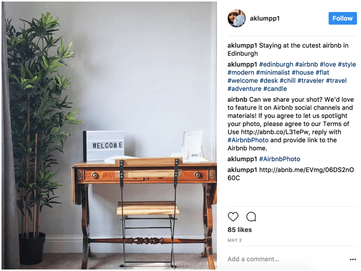I’ll use the Airbnb example again to illustrate UGC best practices. Airbnb reaches out to Instagram users who tag @Airbnb or hashtag #airbnb in their posts, requesting permission to repost these photos in its own feed. The company leaves a comment asking users to go to a link where they can read and agree to Airbnb’s terms of use for UGC. Users are asked to reply with #AirbnbPhoto to confirm and provide the link to the Airbnb home featured.