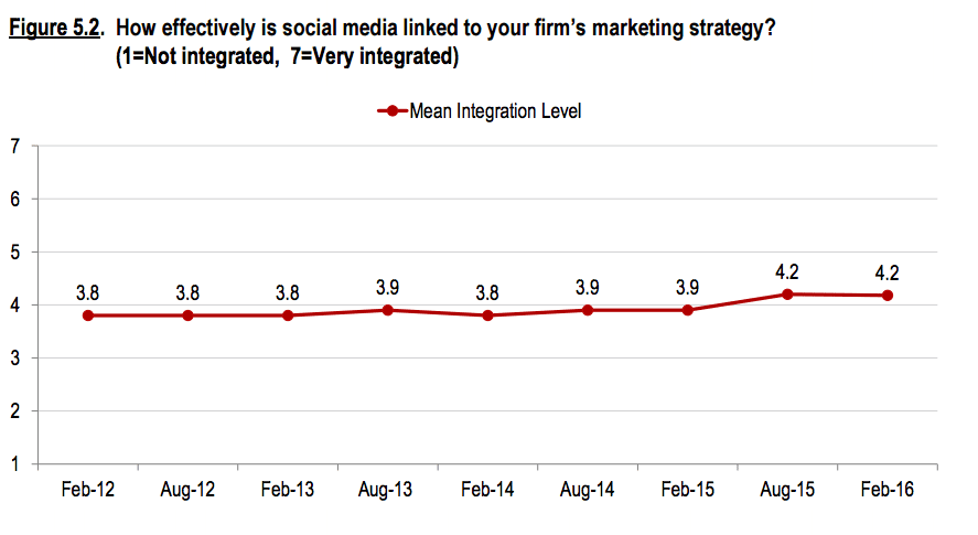 Despite the slight improvement, things are still pretty dire. Only a very small percentage of CMOs must consider their social media to be well integrated into their marketing strategy if the average rating is only 4.2 (out of 7). This only reinforces the need for businesses to spend more time devising a proper strategy and plan for social media, rather than trying to use it first and planning later.