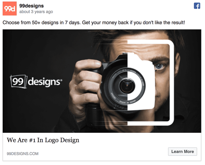 Actually, they are both virtual products, which is why I picked them. In this day and age, many marketers are trying to sell products that you can not hold in your hands or see. I do not see that changing anytime soon, in fact, it will probably get worse. That makes it hard to include a product in your Facebook Ad visual when you technically do not have the traditional definition of a product. It is difficult for sure, but not impossible. Just take a look at the simple but effective way 99Designs showed off their logo design service.