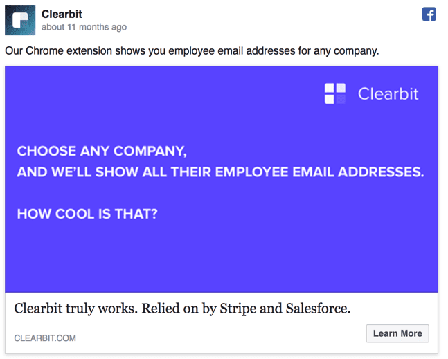 In this case, the font blends into the background image pretty easily and does nothing to grab the reader's attention. In contrast, the text on this Facebook Ad from Clearbit jumps off the page and is easy to read: