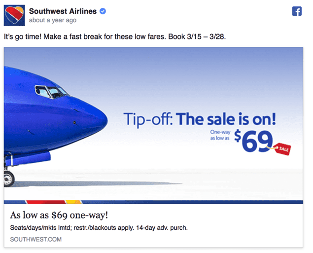 It really is up to you, and since there is not really a wrong way to use icons I will jump to the good examples! In this first Facebook Ad from Southwest airlines, they masterfully use a simple icon to draw your eye to the low price of the flight: