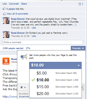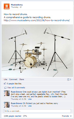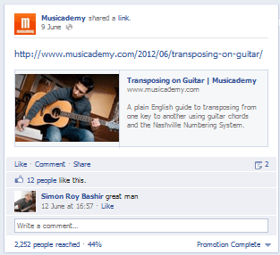 The first post is a typical Musicademy post. The topic is of interest to a fair degree of our audience and we've chosen a relevant photo combined with a comment and link back to our website. This is not promoted and has enjoyed a 27% reach. Pretty good in comparison to Facebook averages for non promoted posts. Helped, I imagine by the fact that our page is highly engaged and there were a good number of likes, comments and a share