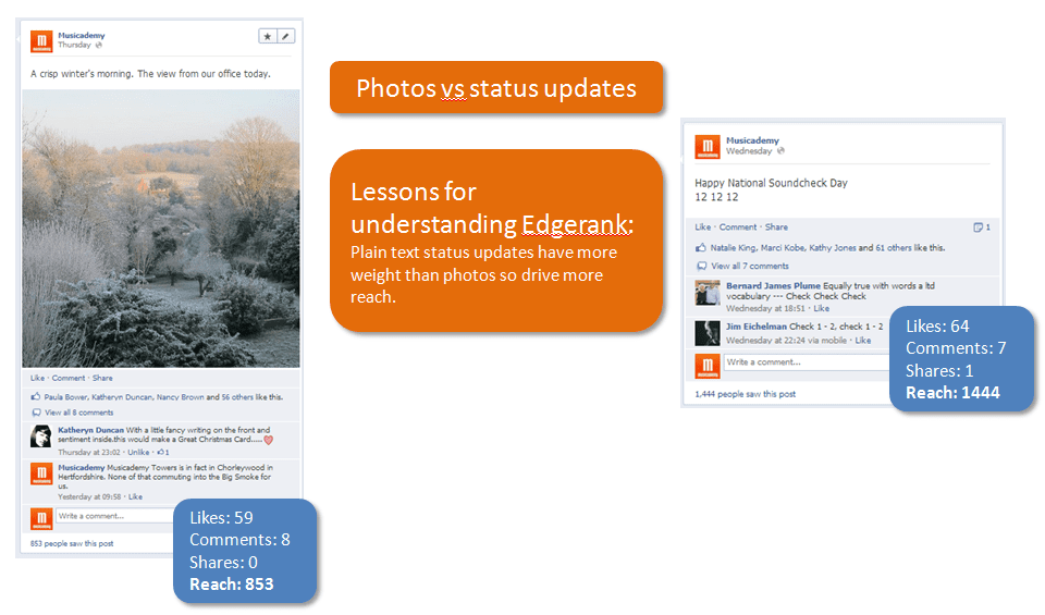 Photos used to enjoy considerable Edgerank weight. Facebook used to reward brands posting images with a high Edgerank score. As brands we got wise to that so many of us were rarely posting a link, question, comment any other content without the accompanying photo. In short we were gaming the system.