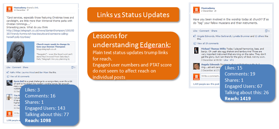 Plain text status updates again appear to win out with the new algorithm. Whilst the plain text post here does have a few more likes and comments than the link, the reach is half as much again despite the engagement rate and PTAT being considerably higher.