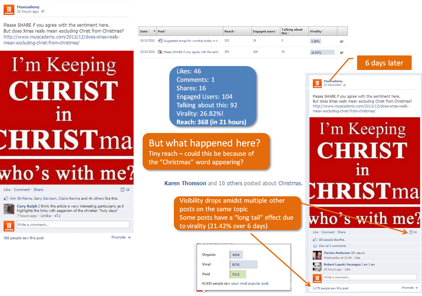 Despite personally finding the "Christ in Christmas" image below a bit cringey, I knew that the Musicademy fanbase would love it. I decided to re-use an article I'd written last year that explored the Christian roots of the Xmas alternative and illustrated it with the image. Cue extraordinarily high virality ( 26%) and yet a reach of only 343 (a reach of only 7%). I can only assume that this is to do with the use of the "C" word in the post. The post would simply have been lost amongst  the multitude of other Christmas-related posts on the newsfeed.