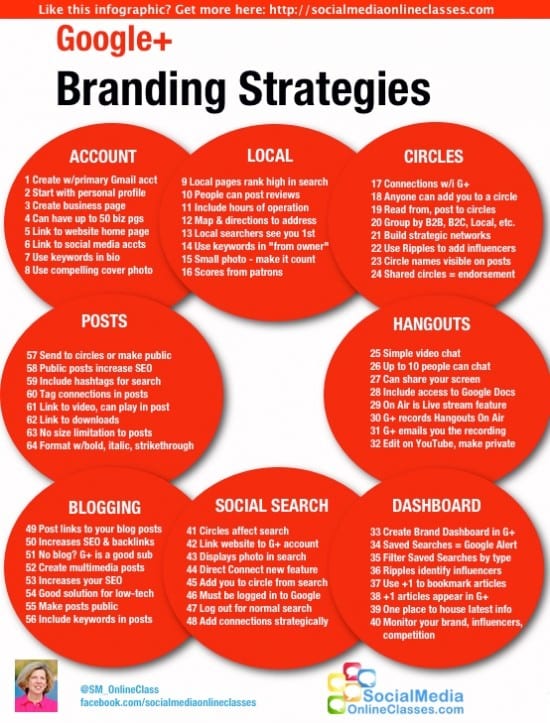 Are you new to marketing on Google+? Or perhaps looking for new ideas on how it can support your branding strategies? This simple infographic from Socialmediaonlineclasses.com is a quick checklist to review suggesting 64 ways to use this growing social media platform.