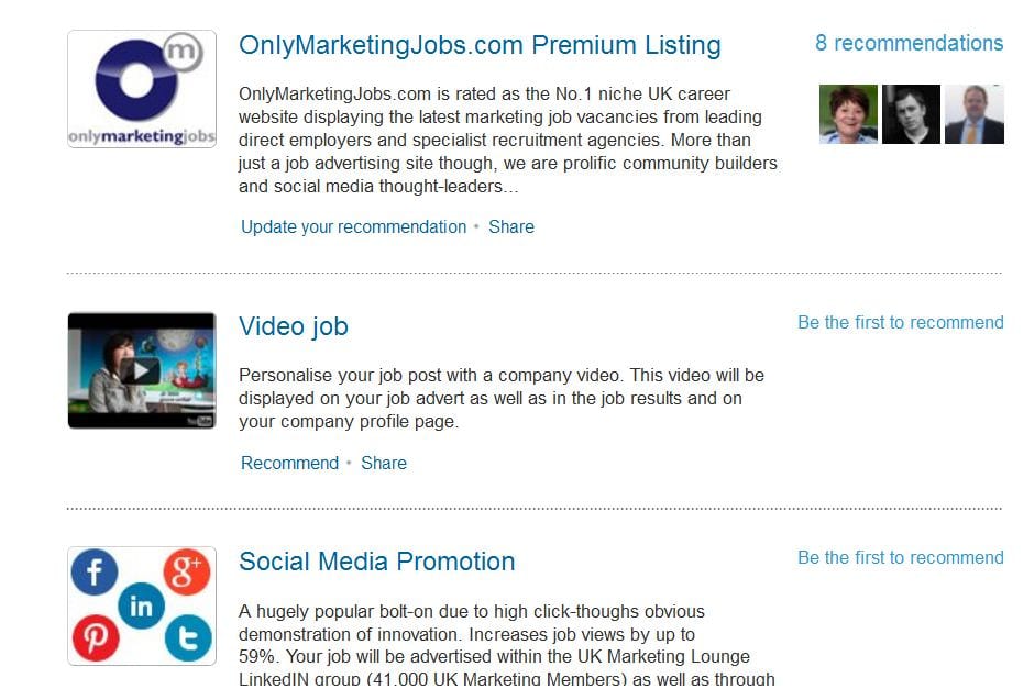 Reviews and recommendations are now needed everywhere. From Google Maps and Facebook Likes to TripAdvisor and now LinkedIn. LinkedIn established personal recommendations at an early stage. There is now a facility to add to individual products and services. The challenge is that it’s much harder to acquire recommendations on products and services on LinkedIn company pages. Only Marketing Jobs has a Group on LinkedIn with over 40,000 UK members, yet only 8 recommendations for its main service.