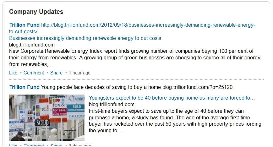 Trillion Fund, a UK company which provides funding for new renewable energy sources, have utilised this feature well by posting regular links to news stories and their own blog posts.